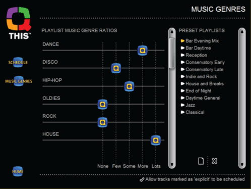 Want some easy listening at lunchtime? Dance music on a Friday night? Quiet ambient music on a Tuesday? It’s easy with Q-THIS™. Set up your schedule and mixes in minutes, not hours.